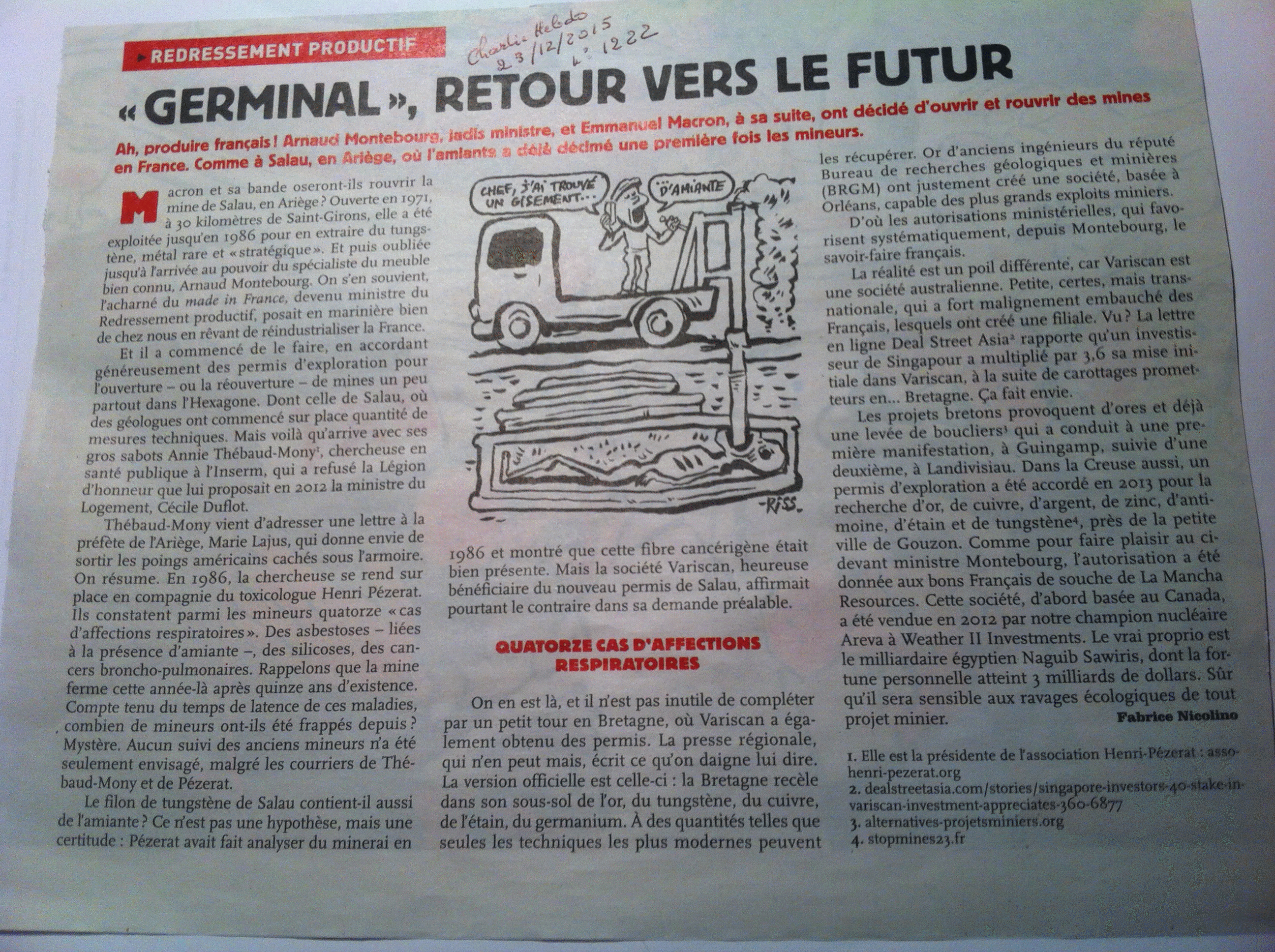 Dans l'émission Terre à Terre de Ruth Stegassy (France Culture) est intervenue, le 19 décembre, Annie Thébaud-Mony ainsi que 2 chercheurs du CNRS sur "la production de l'ignorance" concernant les stratégies mises en oeuvre par les industirels et les états pour empêcher la visibilité des conséquences sanitaires des risques industirels tels que la radioactivité :Alerte sur les dangers que représenterait pour les ouvriers et les riverains une éventuelle remise en exploration de la mine de Salau en Ariège compte-tenu de la composition du minerai qui contient -entre autres toxiques - l'amiante, la silice cristaline et l'arsenic, substances strictement réglementées (lire la lettre d'Annie Thébaud-Mony à la Préfète, sa préface, son rapport concernant les risques sanitaires de cette ancienne mine, le rapport d'Henri Pézerat de 1985 sur les risques liés à la présence d'amiante à la mine de Salau et l'article de Fabrice Nicolino dans Charlie Hebdo du 23 décembre 2015). SIGNEZ LA PETITION.